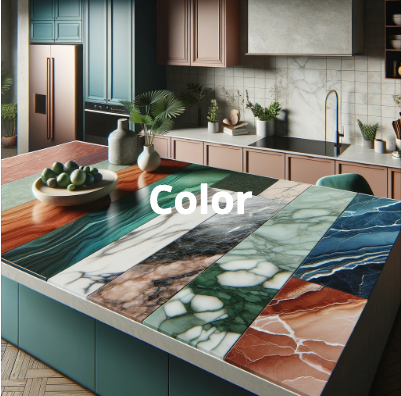 Below is a kitchen countertop showcasing a variety of colors and patterns, including bold vibrant colors like deep blue and emerald green, soft pastel shades such as blush pink and mint green, and distinctive veining patterns in materials like marble and quartz. This setting captures the diverse design choices in a stylish modern kitchen.