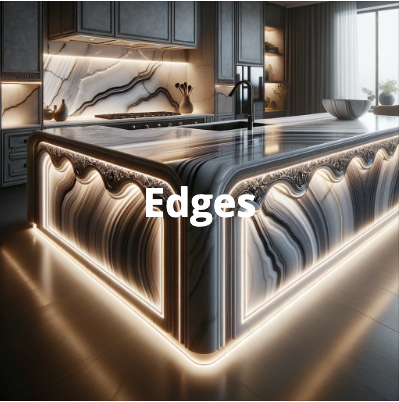 Below is a luxurious kitchen countertop featuring several high-end design elements, including waterfall edges, intricate edging profiles like ogee, bullnose, and bevel, and a backlit effect with translucent materials like onyx or engineered quartz. This setting highlights the dramatic and sophisticated design details in a modern kitchen environment.