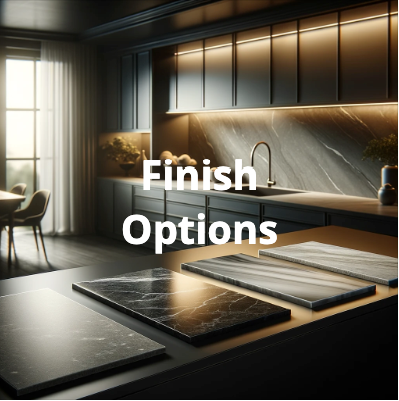 Below is a kitchen countertop showcasing various finishes including a matte finish for a modern look, a polished shine for a luxurious appeal, and a honed finish for a subtle glow. This setting is designed to enhance each finish's unique characteristics in an elegantly designed kitchen.