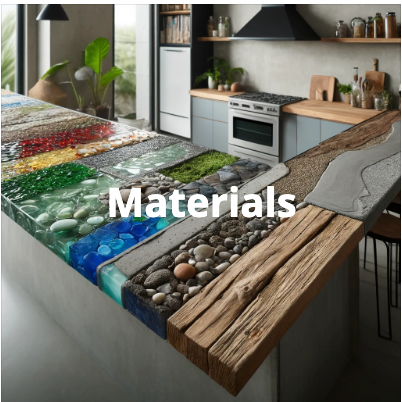 Below is a kitchen countertop showcasing a variety of sustainable and DIY materials, including recycled glass, reclaimed wood, and customized concrete. This setting captures the eco-conscious choices and innovative designs in a contemporary kitchen environment.