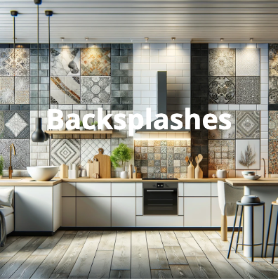 Below is a kitchen depicting a variety of backsplash styles in a modern kitchen, as you described. It shows different sections with backsplashes that match the countertops, create a contrasting look, and incorporate unique patterns. You can view and download the image by clicking on it.