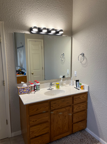 Before: The original sink and vanity area featured a wooden cabinet with a standard countertop. The wood grain, while warm, gave the space a traditional, somewhat outdated feel. The lighting above the mirror was functional but lacked the design element to make the space feel special.