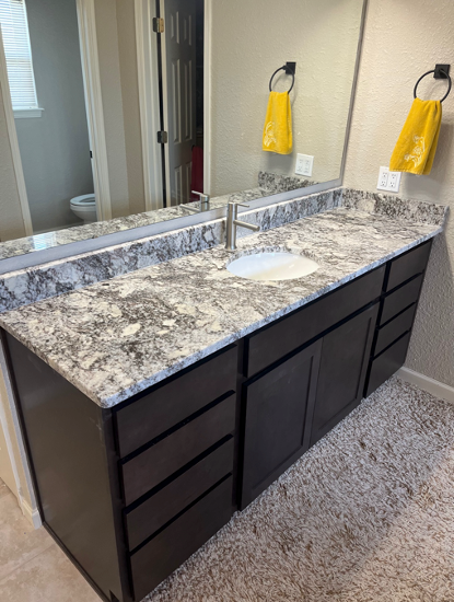 After: In the remodeled bathroom, the vanity area has been transformed into a sleek, modern focal point. The dark, espresso-toned cabinetry provides a rich contrast to the lighter walls and flooring, adding depth and contemporary elegance. The granite countertop with its striking pattern is not only durable but also adds a touch of luxury. Upgraded fixtures, such as the undermount sink and modern faucet, complement the high-end feel of the space. The lighting has also been improved, with modern fixtures that provide better illumination and contribute to the bathroom's overall upscale ambiance.