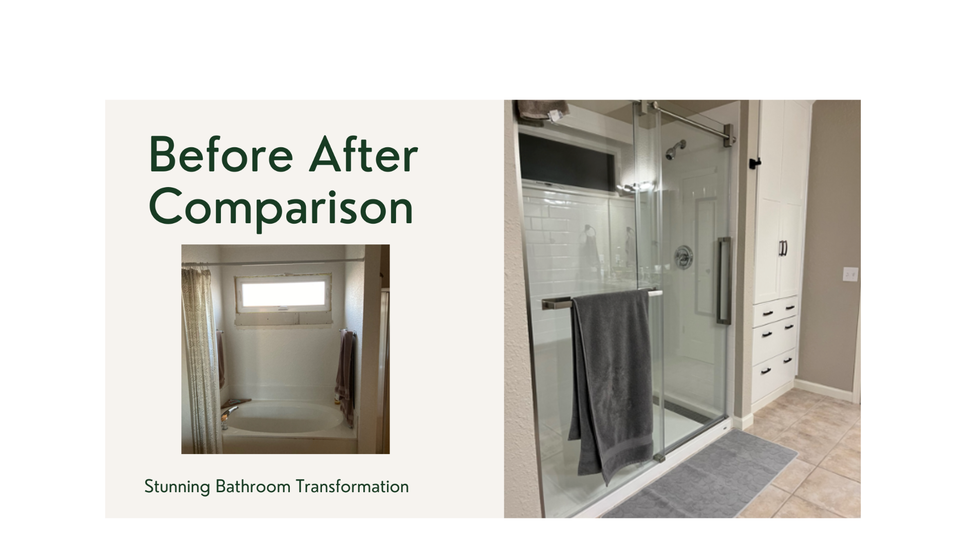 The transformation evident in the before and after images of the bathroom remodel project is quite remarkable, showcasing a transition from a dated and standard design to a modern and sophisticated space. Here’s a breakdown of the improvements: