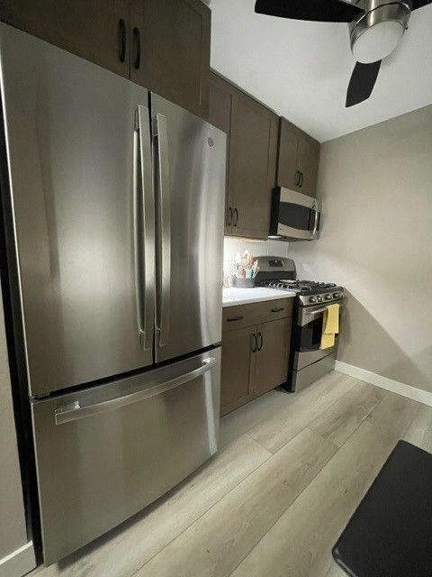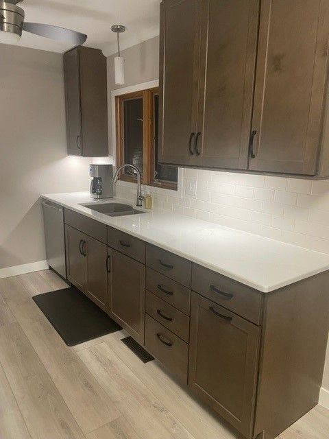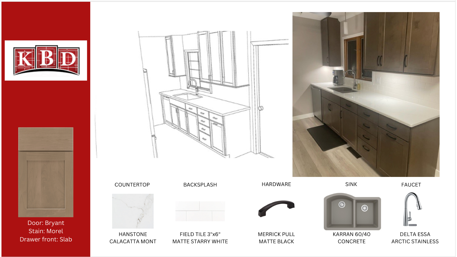 “To modernize this space, we introduced dark stained cabinetry and a calm, soft veined countertop to enhance the sense of spaciousness. Black accents and under-cabinet lighting elevated the remodel, transforming my client's kitchen from Tuscan traditional to modern sophistication.”