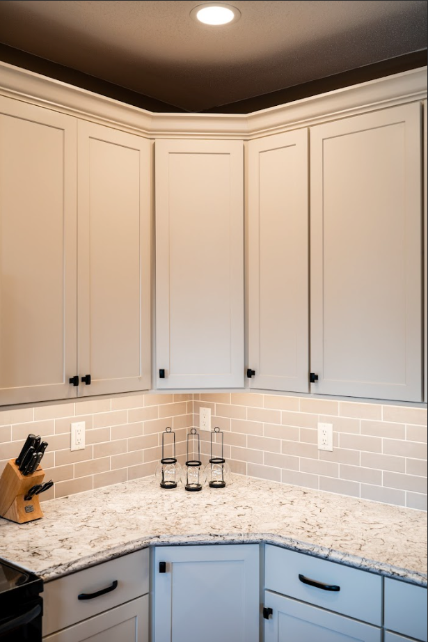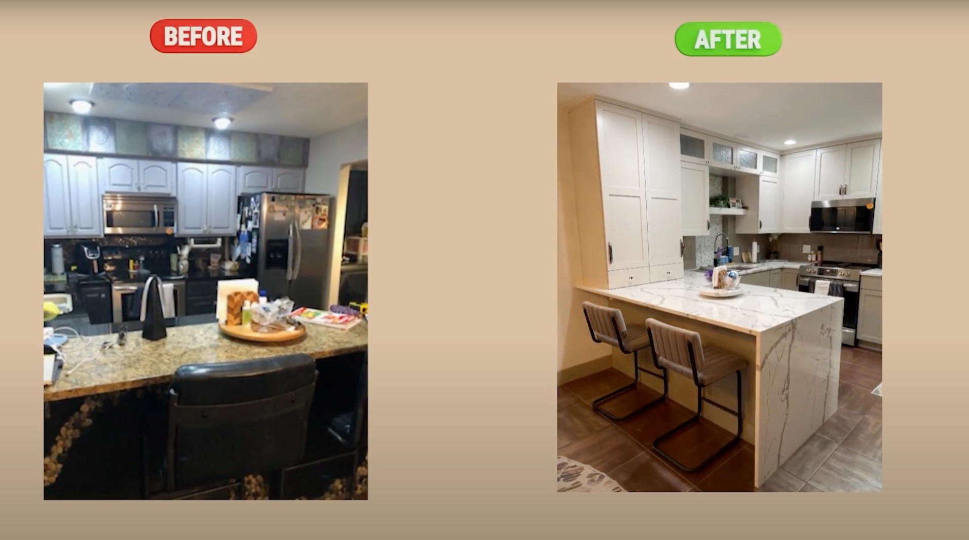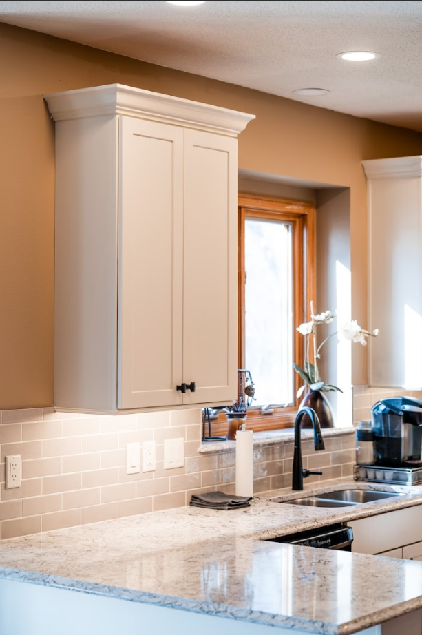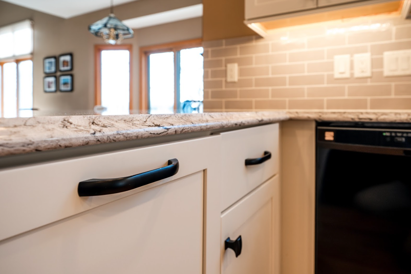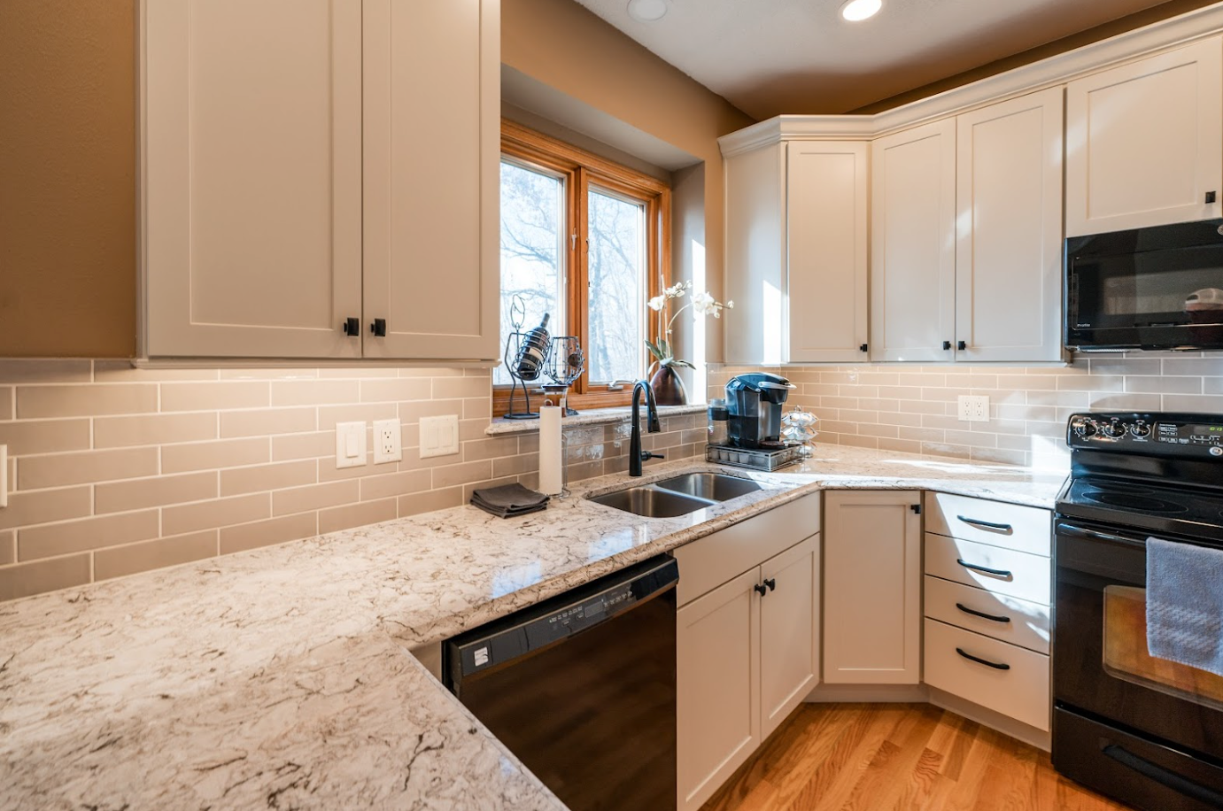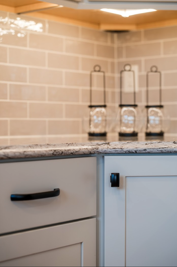By employing light-toned cabinetry alongside complementary veined quartz counters and unobtrusive subway tiles, we transformed the ambiance while maintaining focus on practicality; former workspace is thoughtfully adapted to accommodate ample storage.