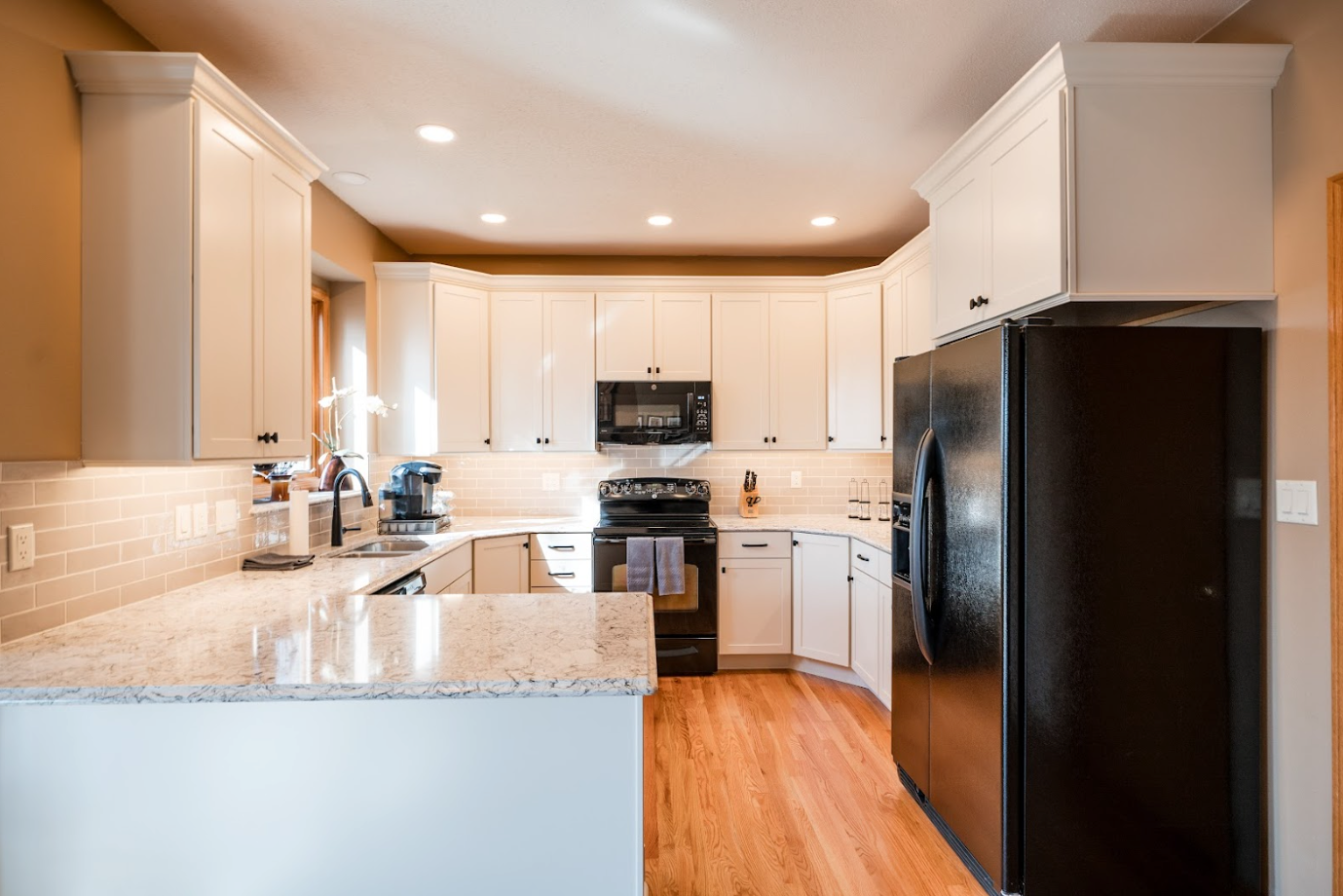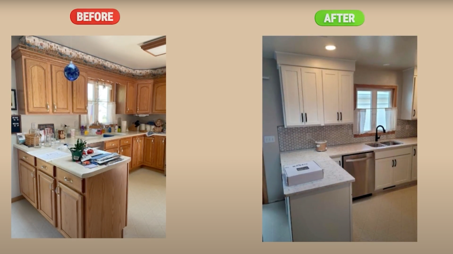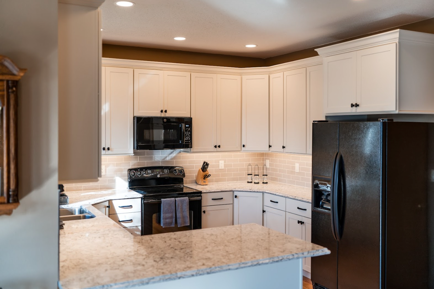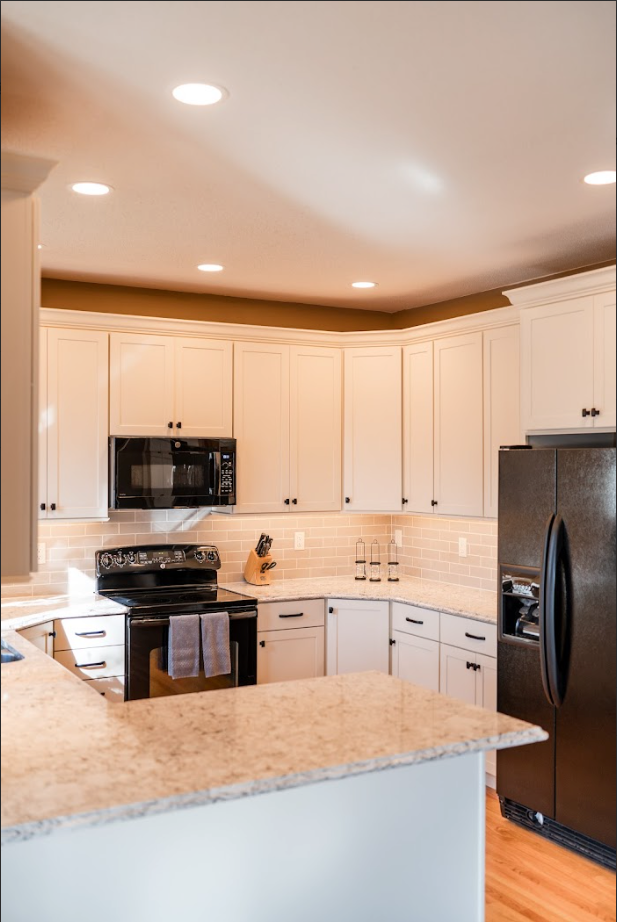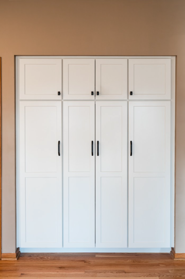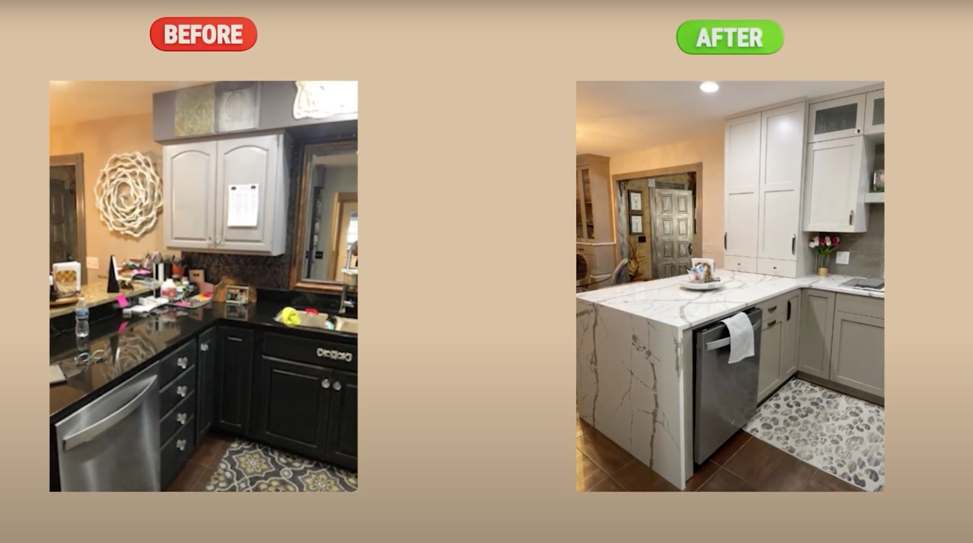 By employing light-toned cabinetry alongside complementary veined quartz counters and unobtrusive subway tiles, we transformed the ambiance while maintaining focus on practicality; former workspace is thoughtfully adapted to accommodate ample storage.