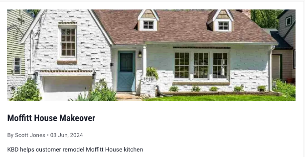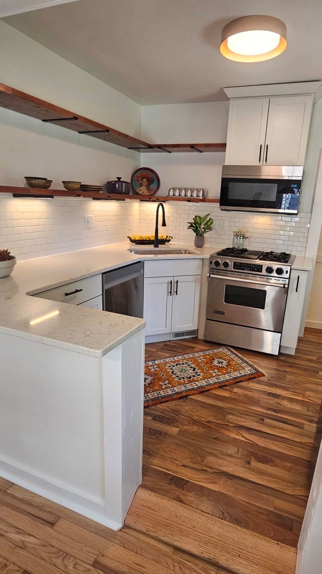 KBD Designer, Micki Craigmile's main goal in updating the kitchen was to preserve its unique history and honor its builder, Howard F. Moffitt. We transformed the small kitchen by keeping it light and open, reorganizing appliance layouts, and maximizing vertical storage with high wall cabinets. Open floating shelves enhanced the spacious feel and opening half a wall allowed more light from the dining/living room, creating a cozy breakfast counter. The remodel maintains the home's historic cottage charm with modern updates.