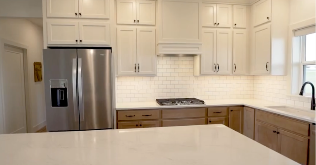 New light-toned cabinetry alongside complementary veined quartz counters and unobtrusive subway tiles.