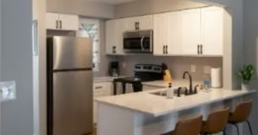 This small kitchen was redesigned to be light and open including vertical storage with high wall cabinets.