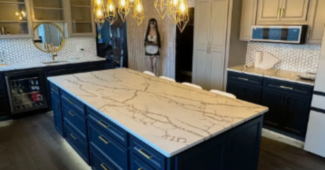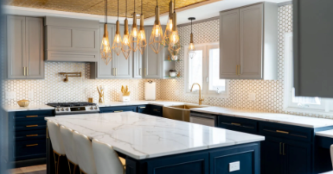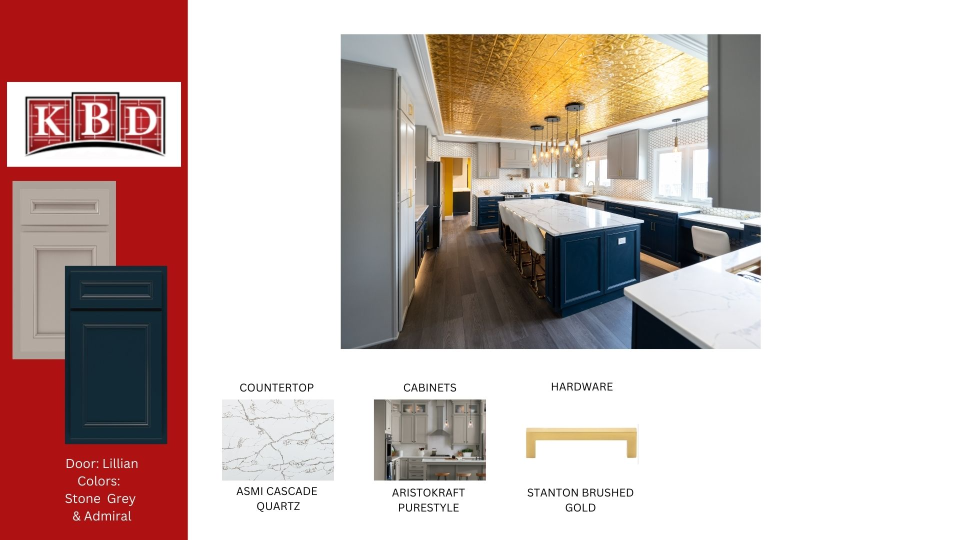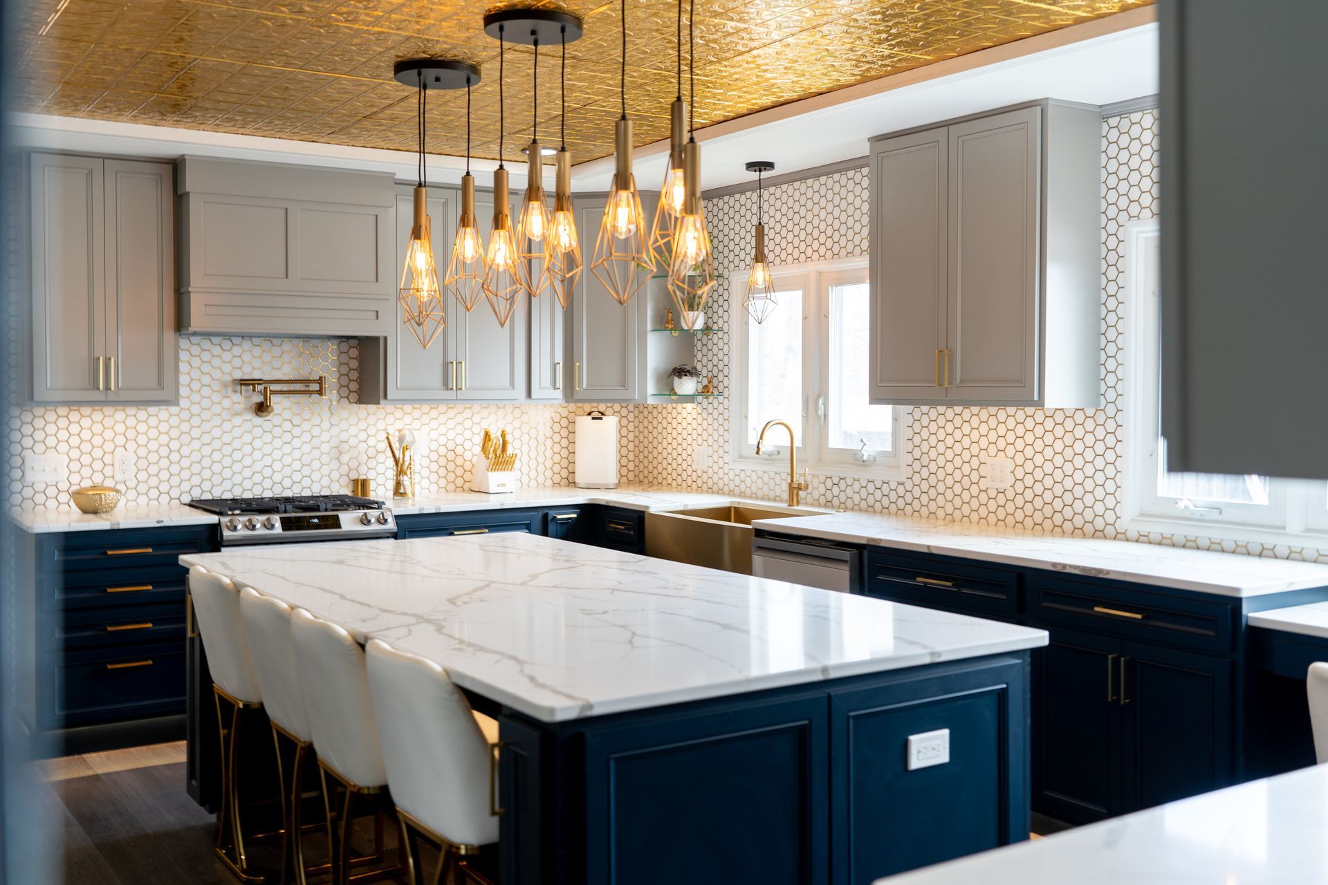 I was asked to help rework this kitchen layout after the homeowners experienced a leak in their kitchen. We added in fun design elements like a decorative wood hood above the stove, desk area under the window, walk through pantry, and a massive kitchen island! Countertop space was a must and we wrapped cabinets and counters around the kitchen even fitting in a bar sink and wine fridge. The brushed gold hardware and fixtures really pop with the navy-blue lower cabinets and the gray upper cabinets are a nice contrast against the gold ceiling.